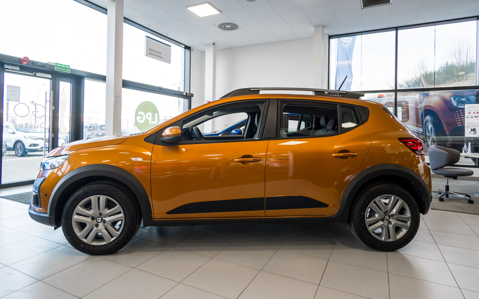 Sandero dostępne jest także w uterenowionym wydaniu Stepway. Model ma typowe cechy crossovera: większy prześwit, relingi dachowe z logo modelu, szerokie nakładki na nadkola i wzmocnienia w dolnej części drzwi wyróżniające się inną fakturą. Do tego dochodzą chromowane logo Stepway pod osłoną chłodnicy i wyraziste listwy nad światłami przeciwmgłowymi. Przedni i tylny zderzak mają osłonę w kolorze metalu. Dodatkowo Nowe Sandero Stepway zostało w standardzie wyposażone w relingi dachowe, które można zmienić w bagażnik dachowy.